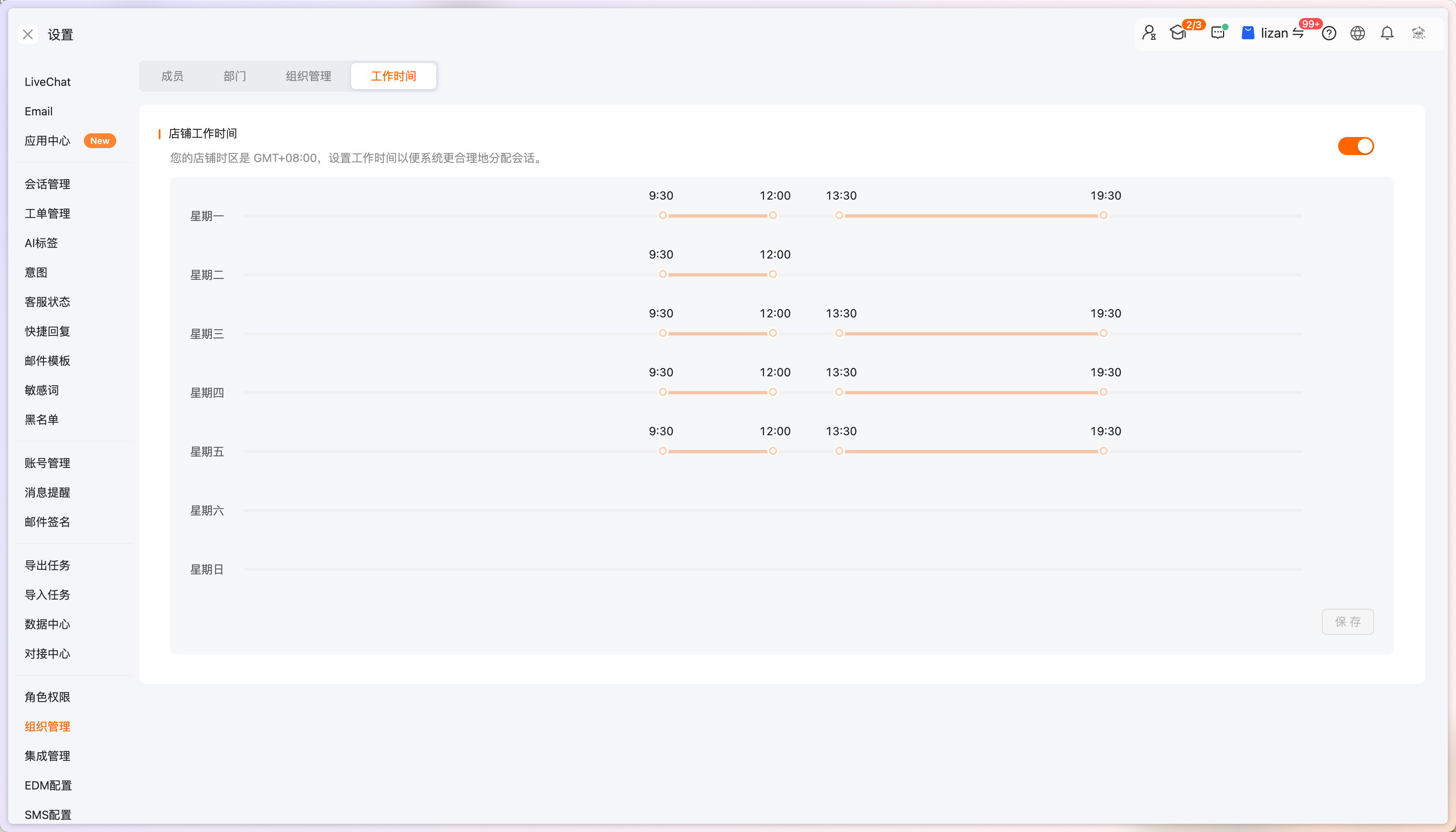 管理员可在【组织管理/工作时间】设置店铺内客服团队的工作时间,工作时间会影响系统对会话或工单的分配。