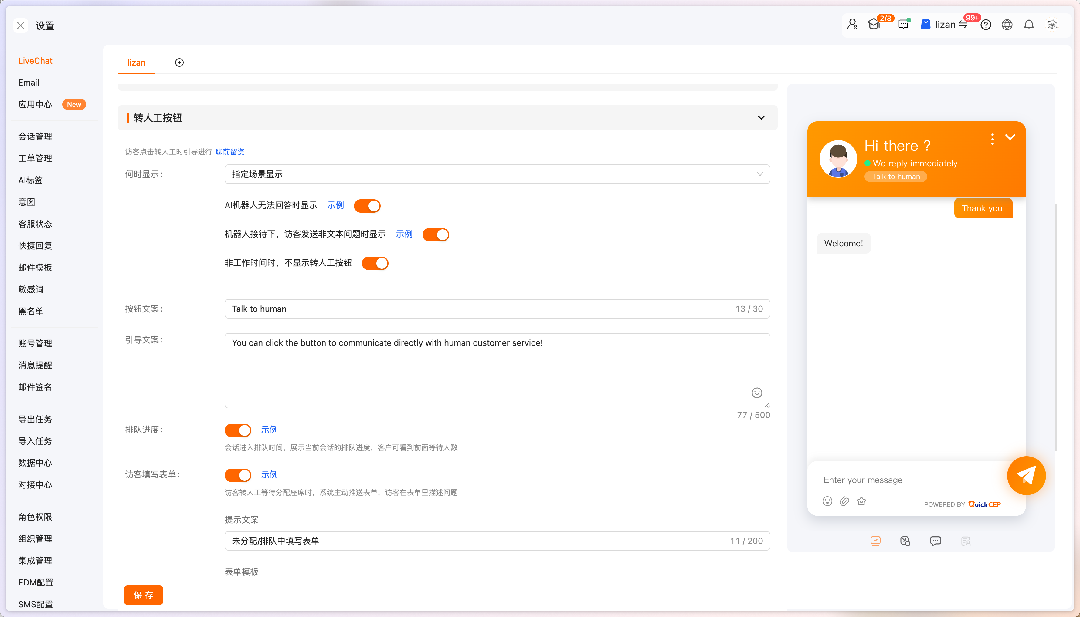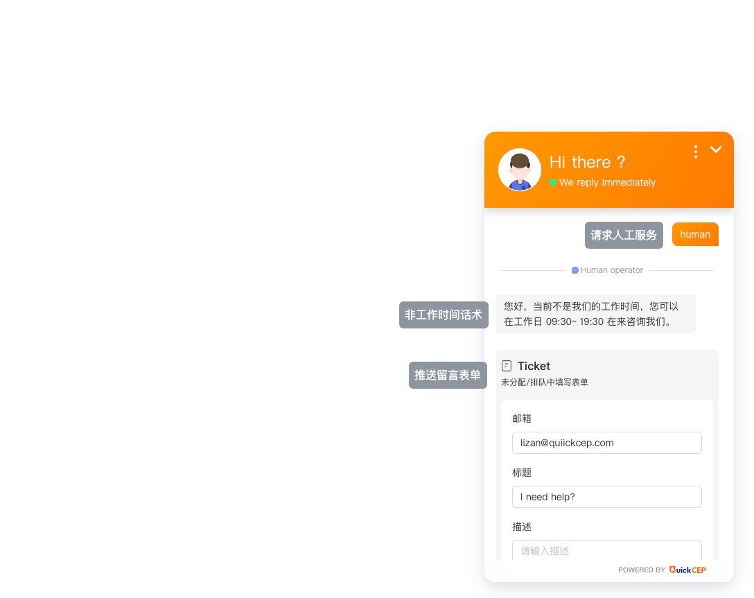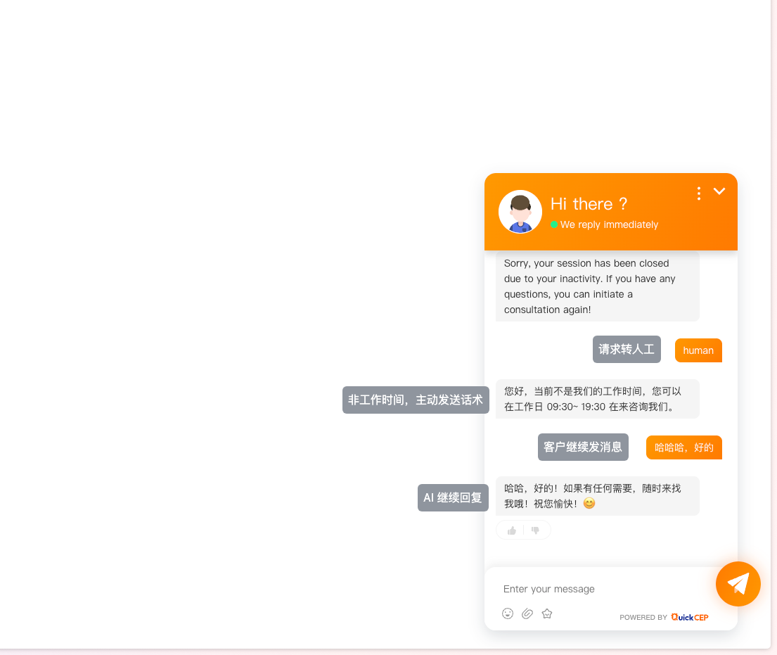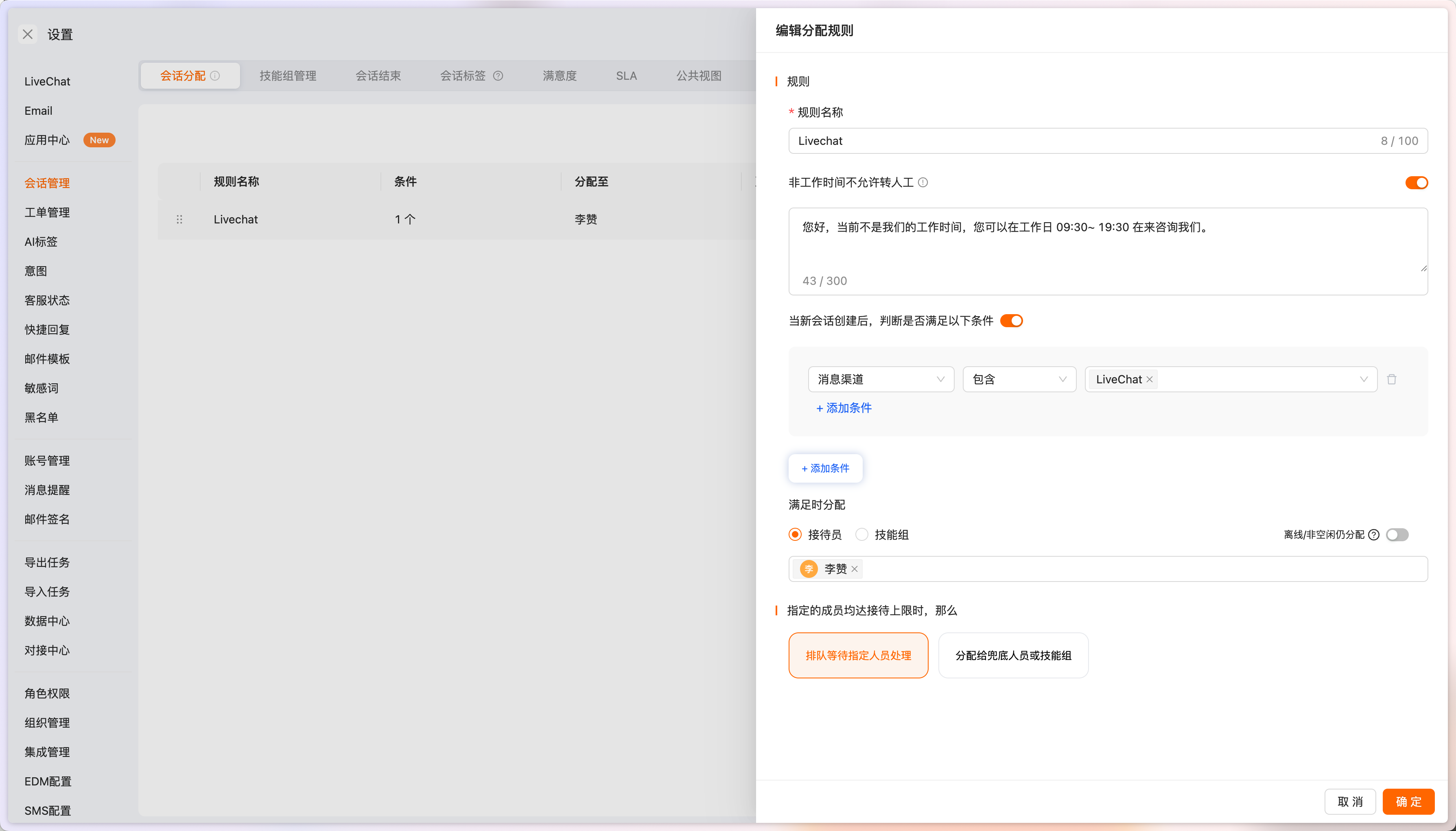 店铺配置好了工作时间段后,Livechat 可以设置在非工作时间不显示「转人工」按钮,系统在分配会话命中分配规则时,会先检查分配规则是否开启了非工作时间不分配,开启的话会直接通知客户转人工失败。