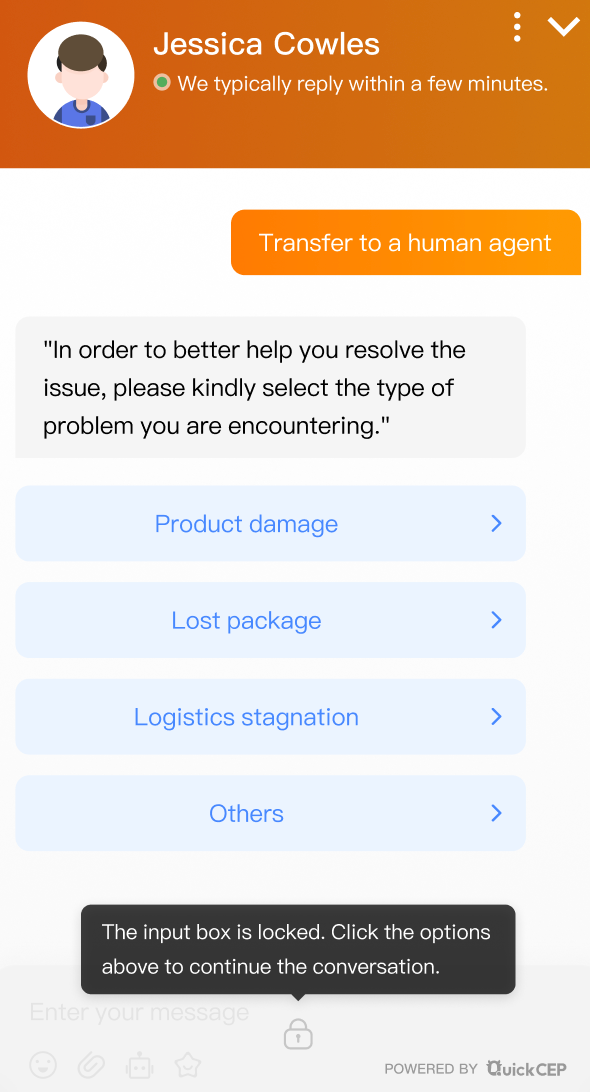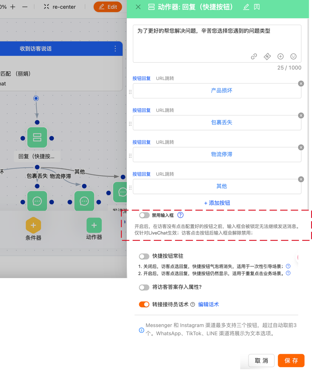 - 开启后,当流程进行到该按钮模板节点时,访客端聊天输入框被禁用;当访客点击按钮模板任一按钮后,输入框解除禁用
