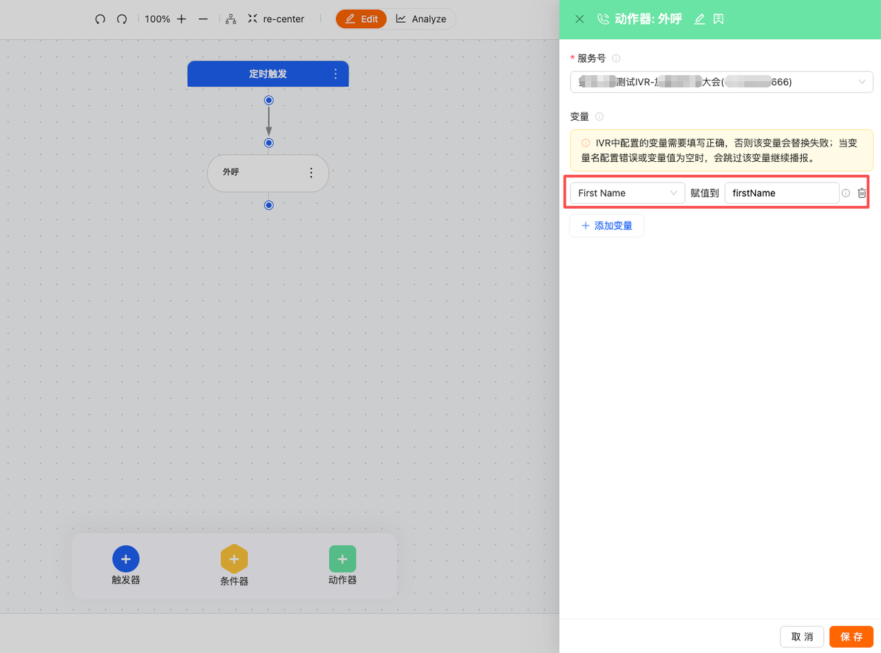 动作器中增加「外呼」选项,支持选择已经配置好IVR流程的服务号,并配置触发器发起外呼;外呼流程需要提前在IVR系统中配置好,播放文本内容如果有变量,需要在「外呼」节点中做好映射关系;使用场景:使用定时器触发器,提前圈好人群,并按时对有电话号码的人群发起外呼;