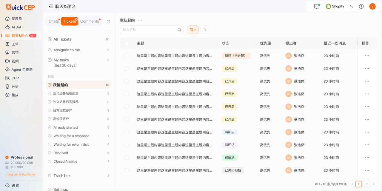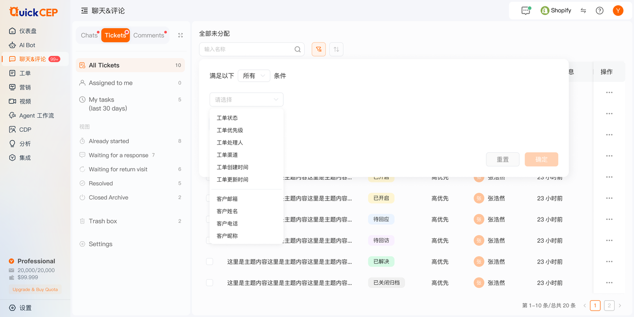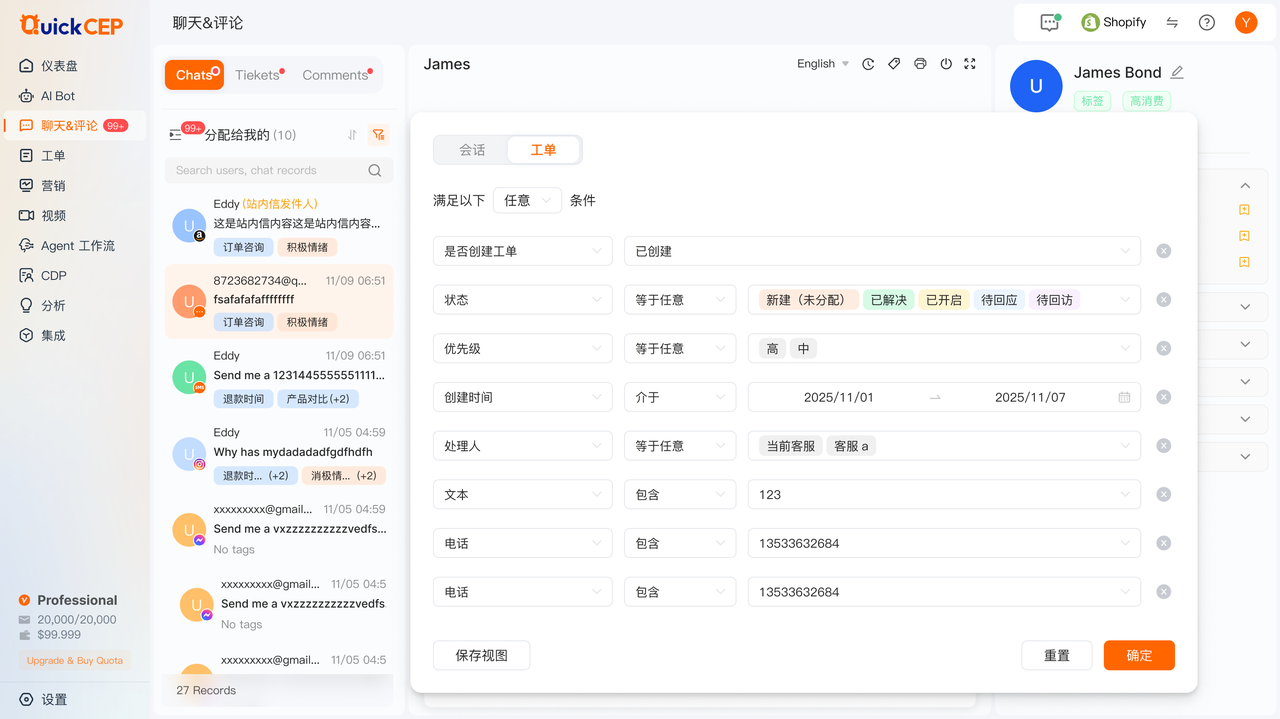 在会话筛选面板,您现可按工单属性进行精准筛选。支持筛选的工单属性包括: