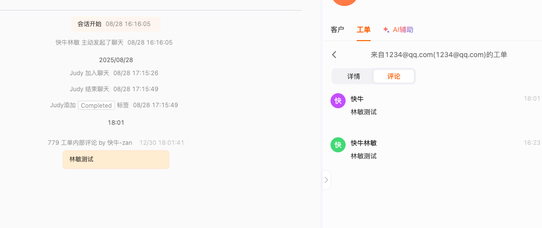 启用“会话即工单”或手动创建工单后,二线客服在工单中发表的评论将自动同步至对应会话中。