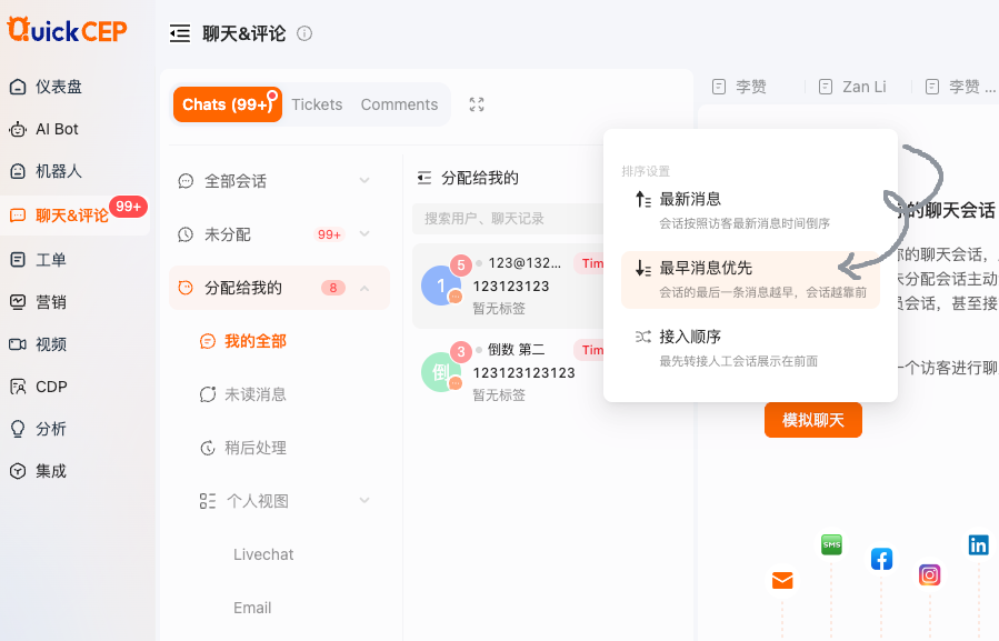 会话列表排序增加「最早消息优先」选项,可优先展示等待时间更久的会话,便于处理积压会话。