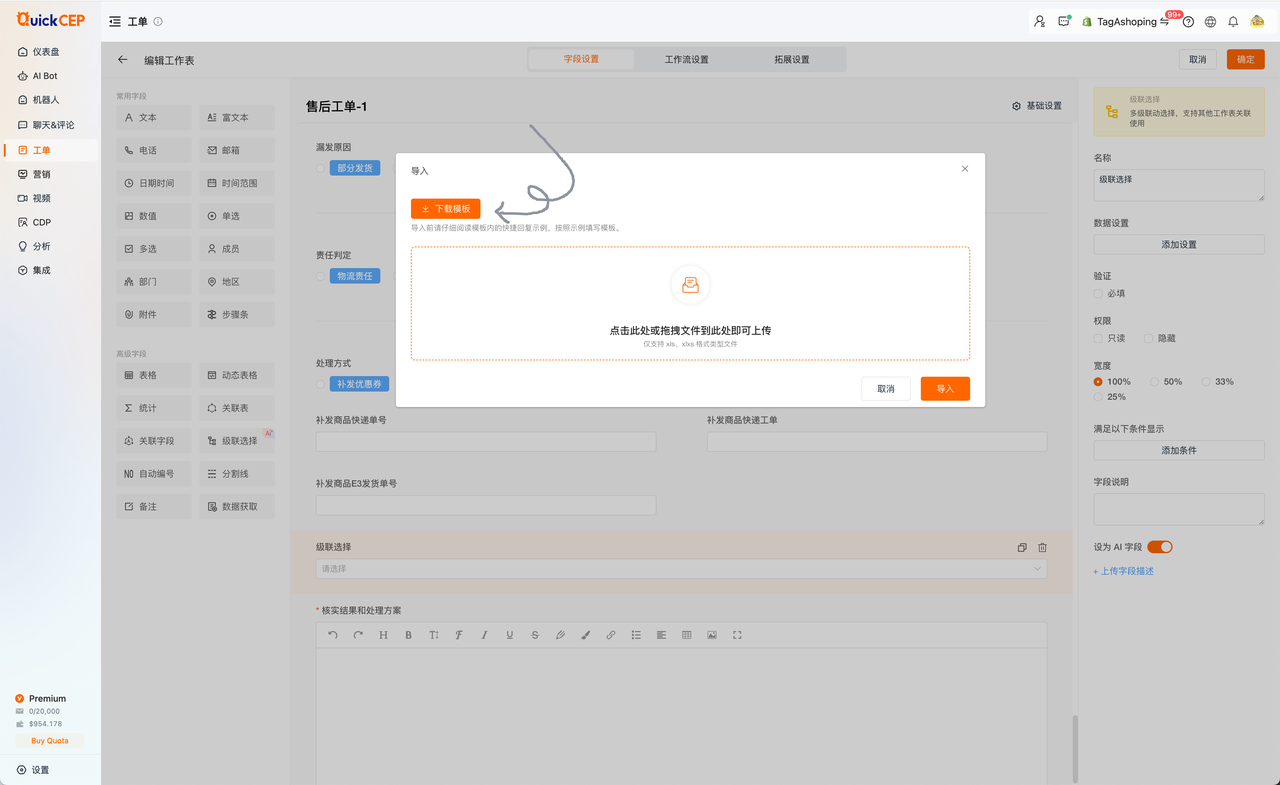 1.访问工单表,将级联字段设置为 AI 字段,并根据要求上传级联字段的描述