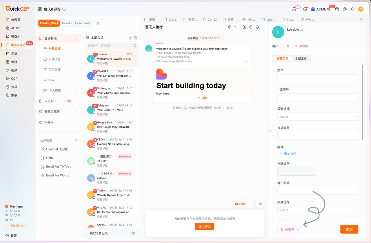 管理员在配置工单表单时,可以允许由 AI 来根据消息内容自动填充级联字段的值。客服点击「AI 填写」功能时,大模型会根据消息内容从已有的 AI 选项里抽取出相对最符合描述的一个选项。