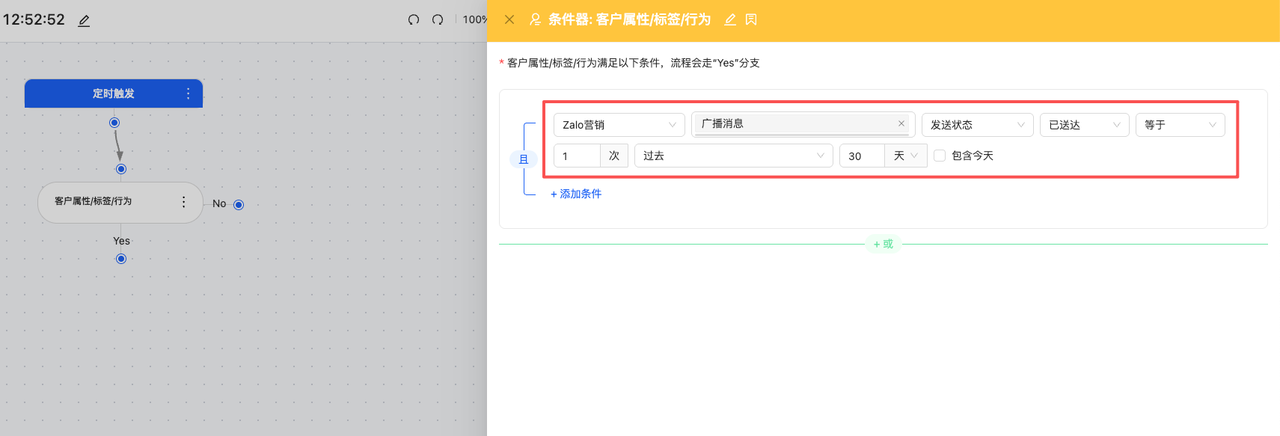 - 筛选"已送达Zalo营销活动,至少1次"的用户,追加营销策略