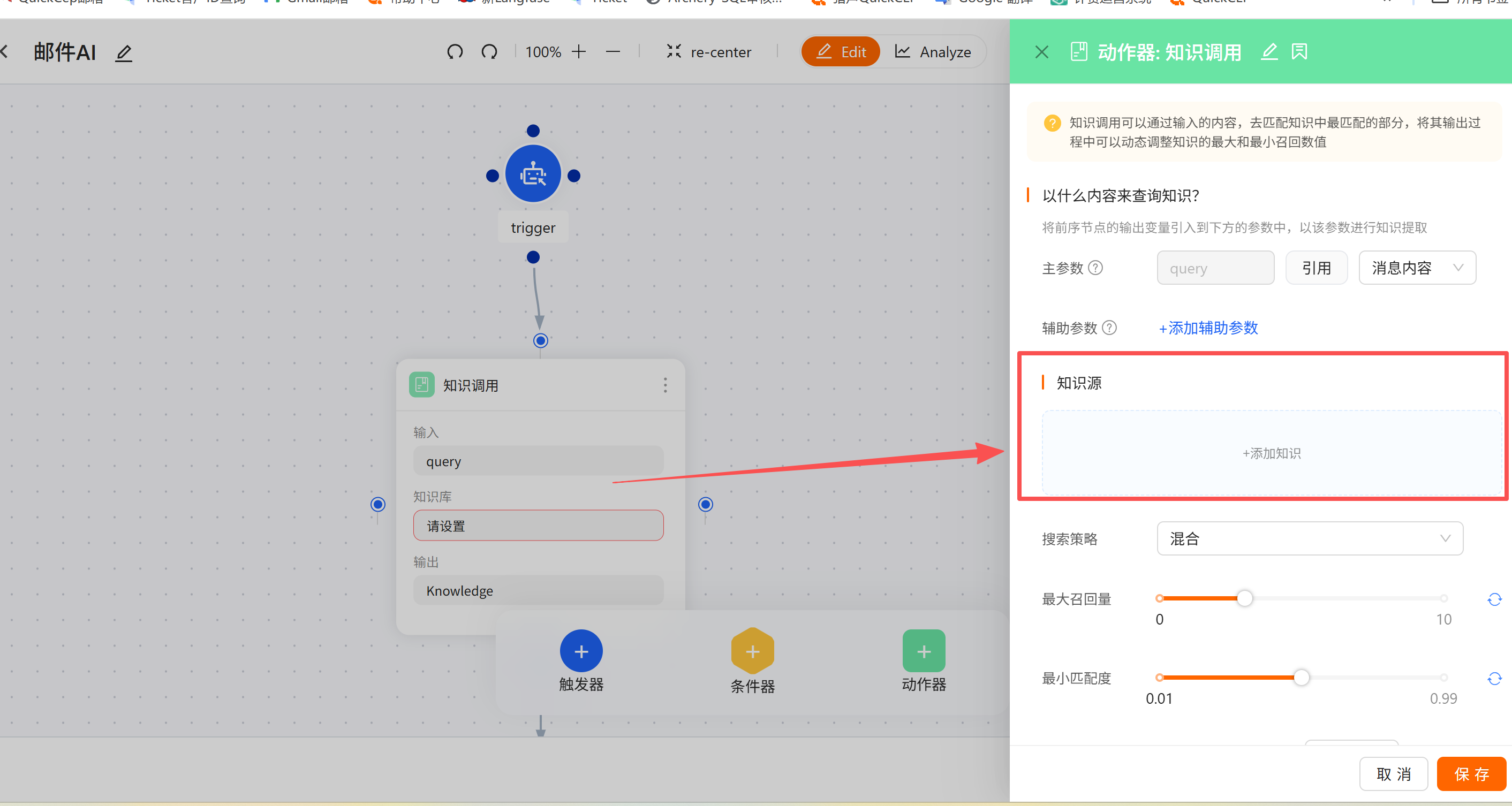2. 修改flowbot名称—拖拽“点击bot按钮触发器”—拖拽“知识调用,LLM大语言模型,回复邮件3个动作器”——连接各节点