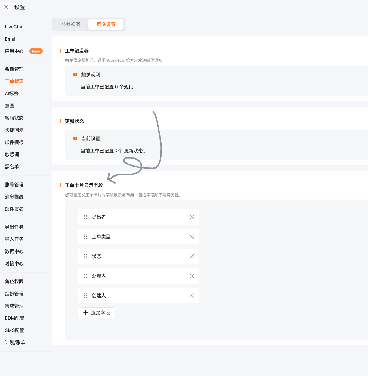支持用户自定义工单卡片的显示字段,把重要的字段放出来,不重要的系统字段隐藏掉。根据业务需要,更加合理便捷的控制字段显隐。