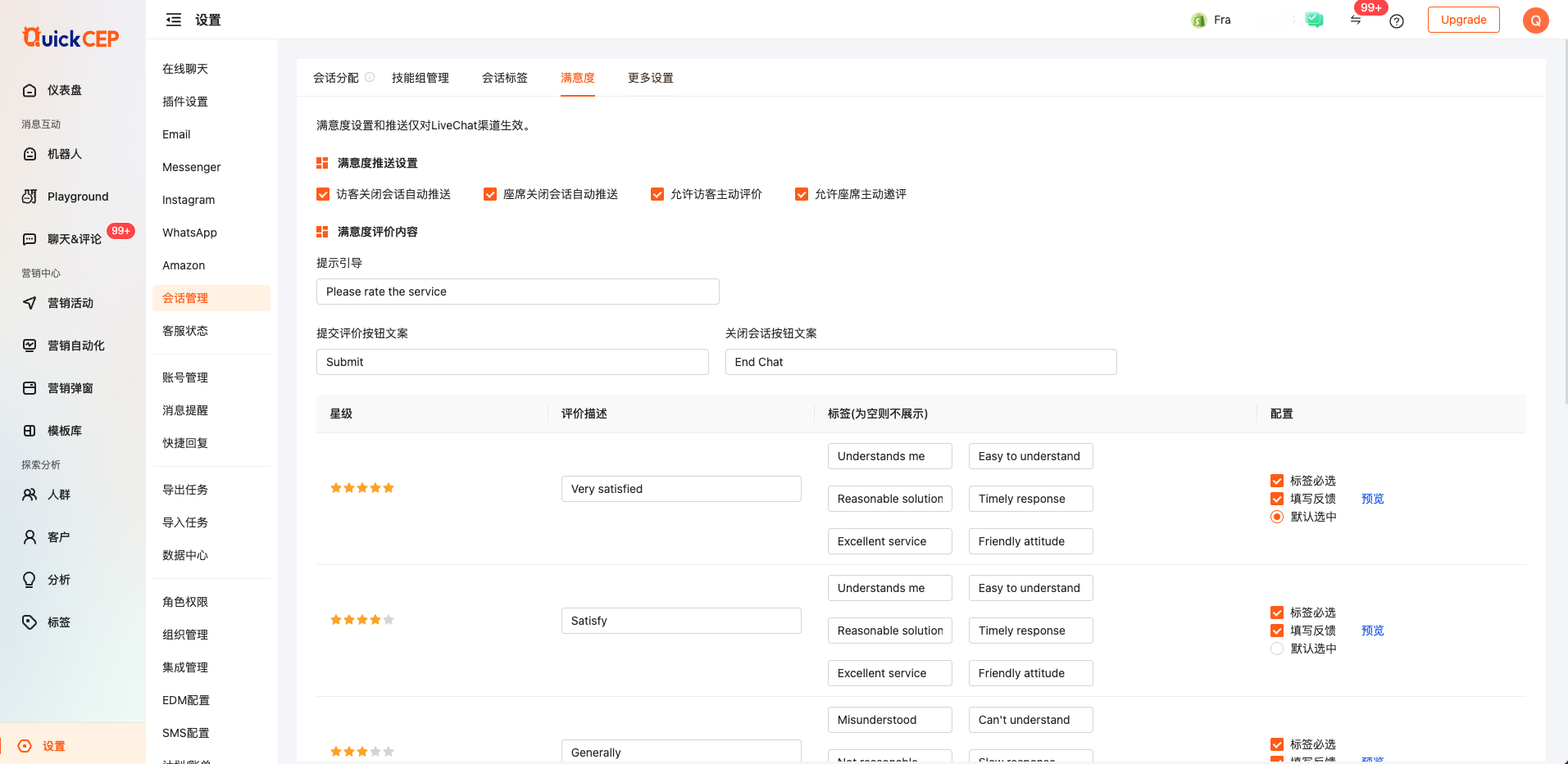 (1)后台配置满意度样式和文案满意度推送支持“访客关闭会话自动推送”、“座席关闭会话自动推送”、“允许访客主动评价”、“允许座席主动邀评”四种方式,并支持用户自定义满意度评价内容和样式。