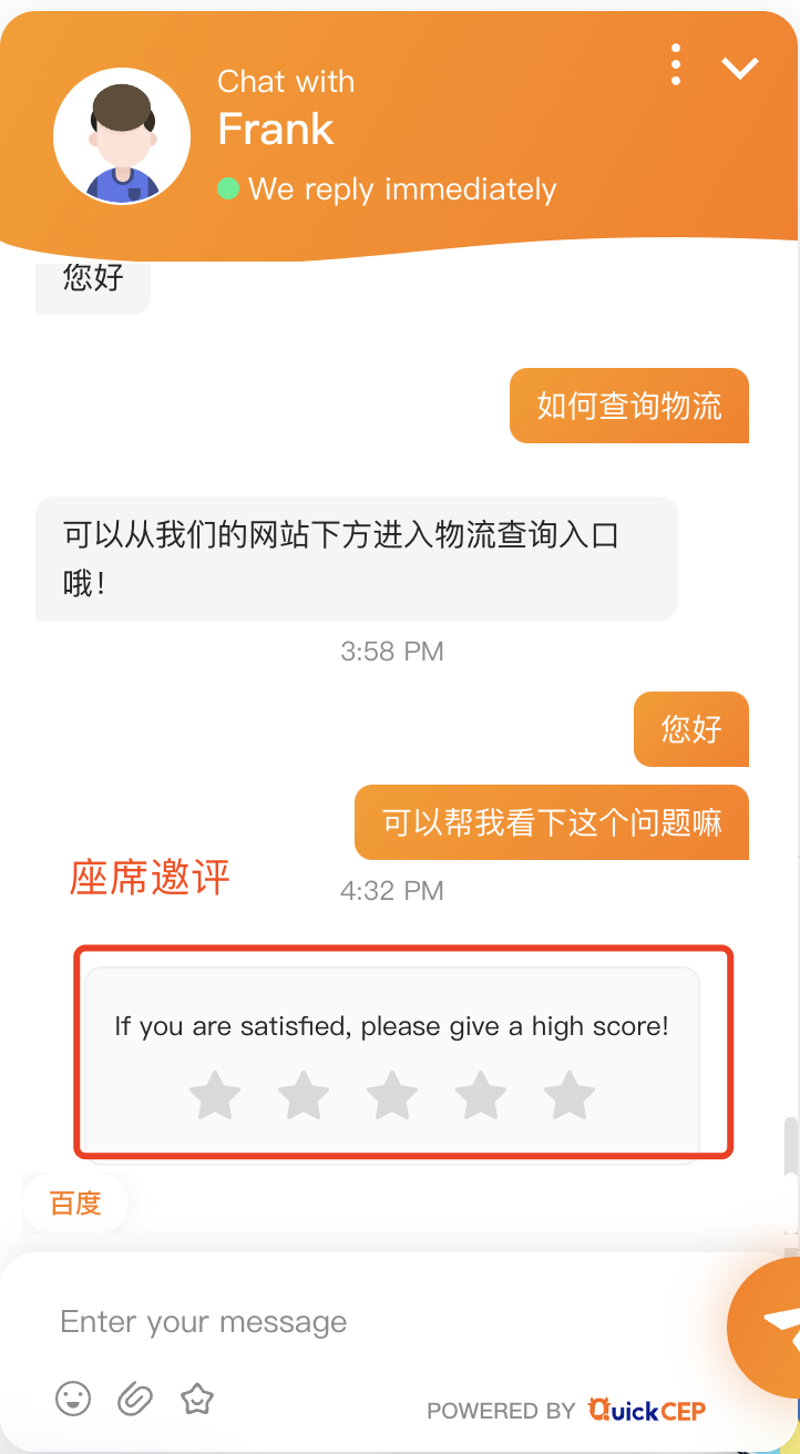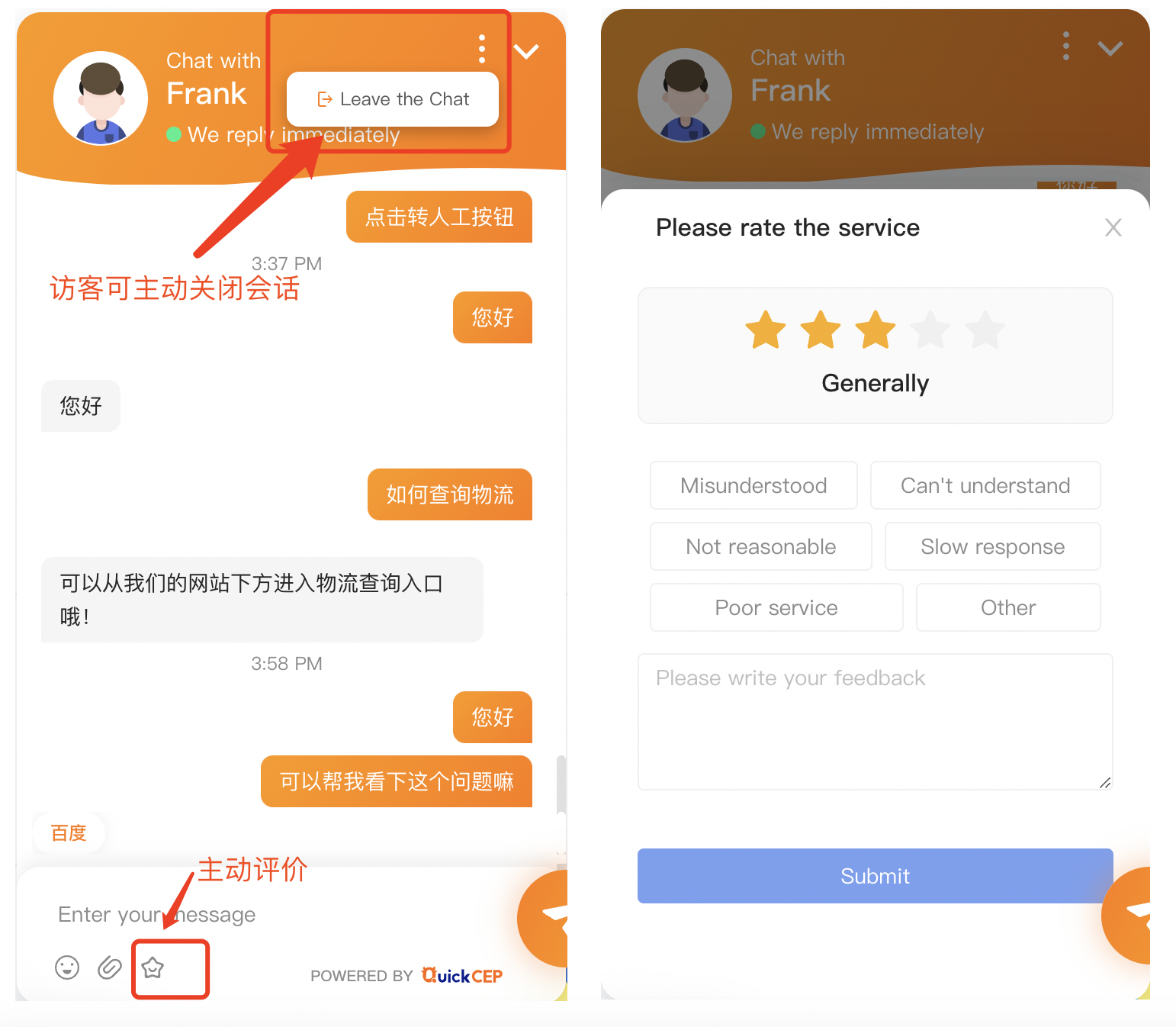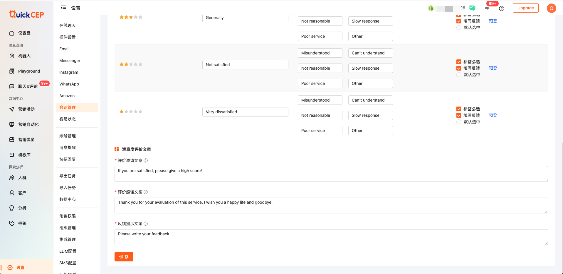 (1)会话满意度体系:支持自定义配置满意度样式文案,机器人阶段支持访客主动结束会话;