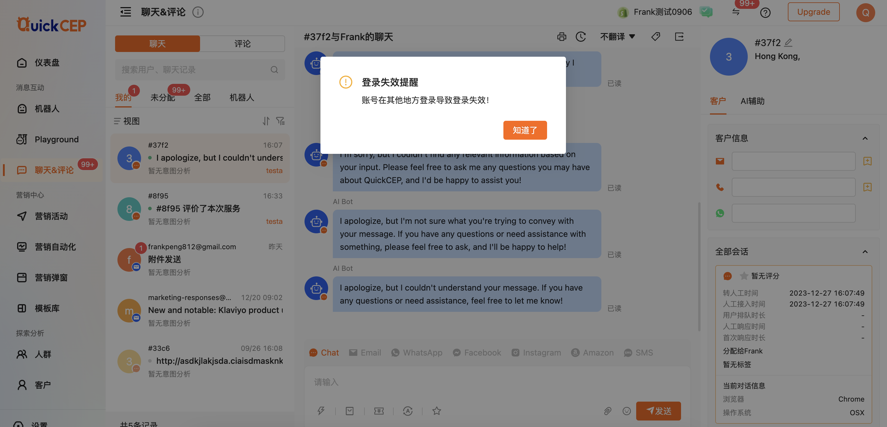 (4)若会话在机器人阶段,则访客可关闭结束会话;若会话转人工后,则访客关闭会话不会真正结束会话,只允许座席结束会话。