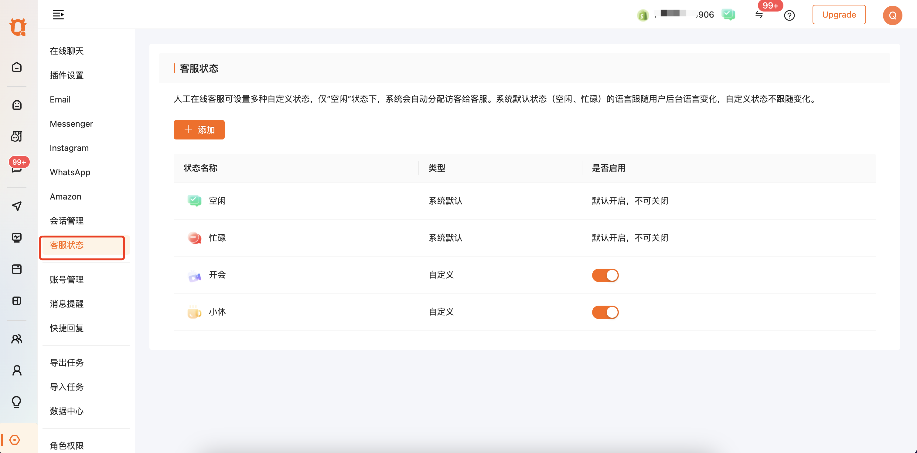(1)客服状态自定义配置,系统默认“空闲”、“忙碌”两种状态