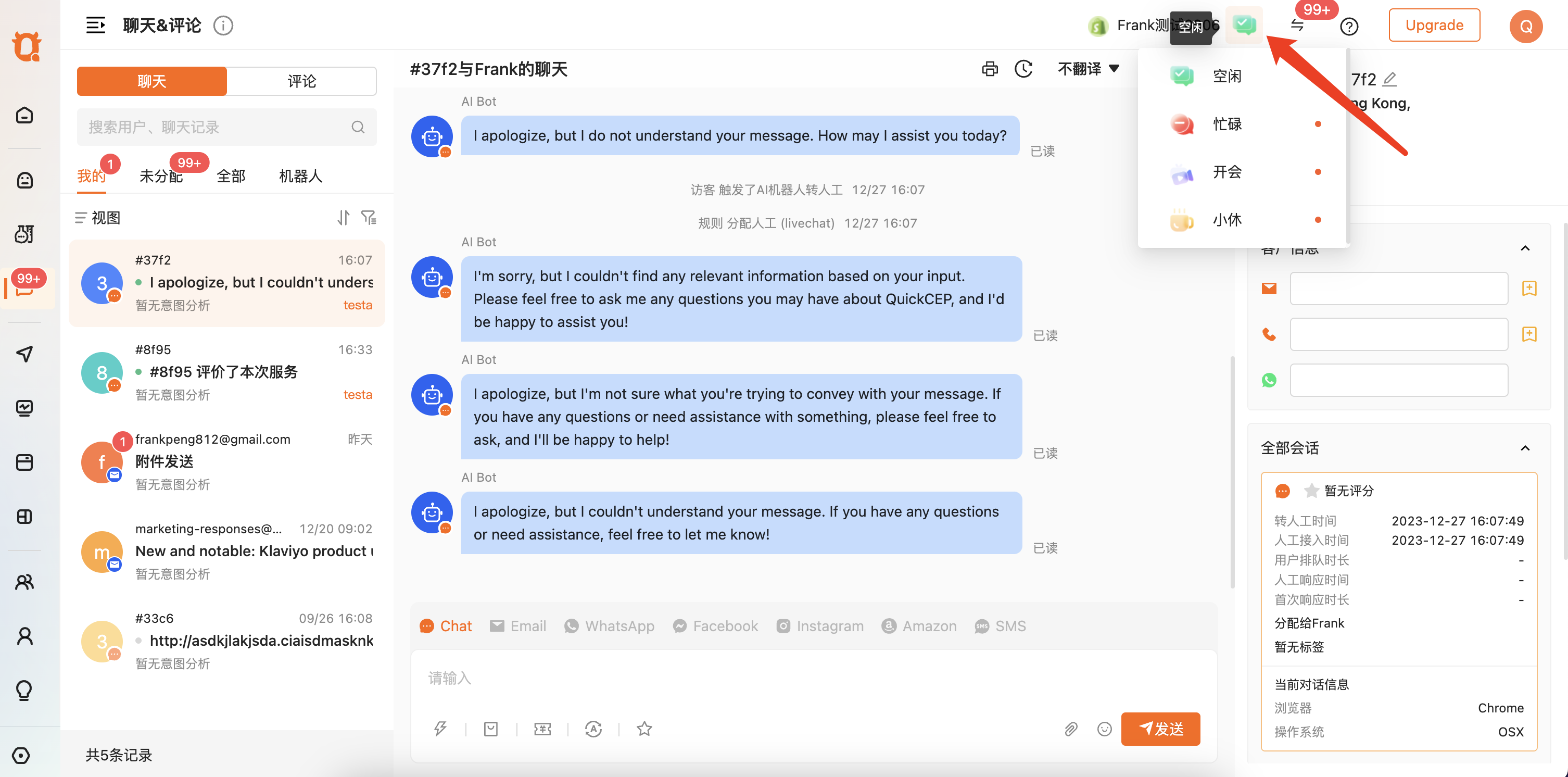 (2)座席人员可根据情况随时切换在线状态,非空闲状态下,系统不自动分配会话
