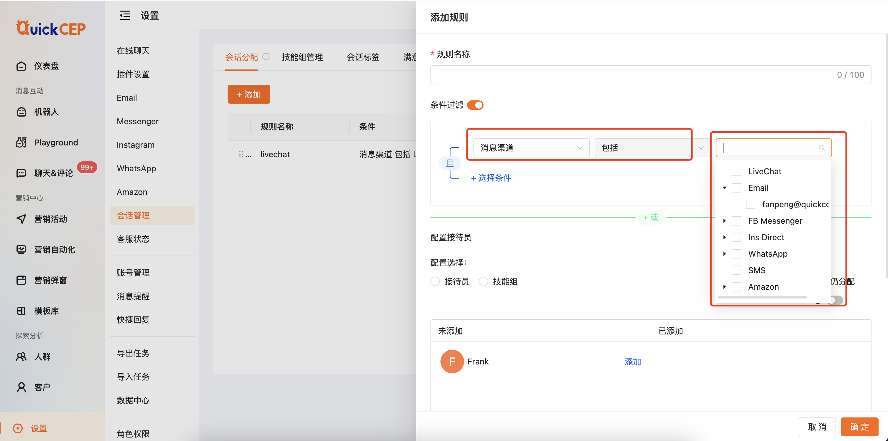 (4)会话分配:会话分配规则支持WhatsApp、Amazon渠道分配,支持按照账号级别进行分配设置;