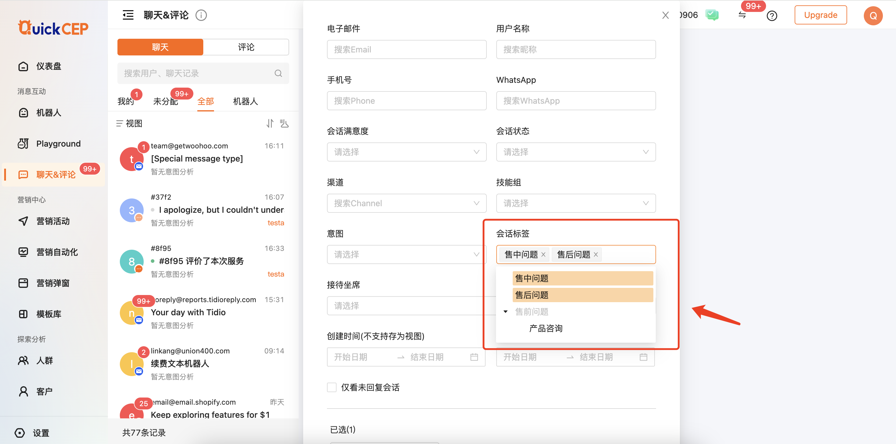 我的、未分配、全部分组会话中支持按照会话标签进行筛选会话