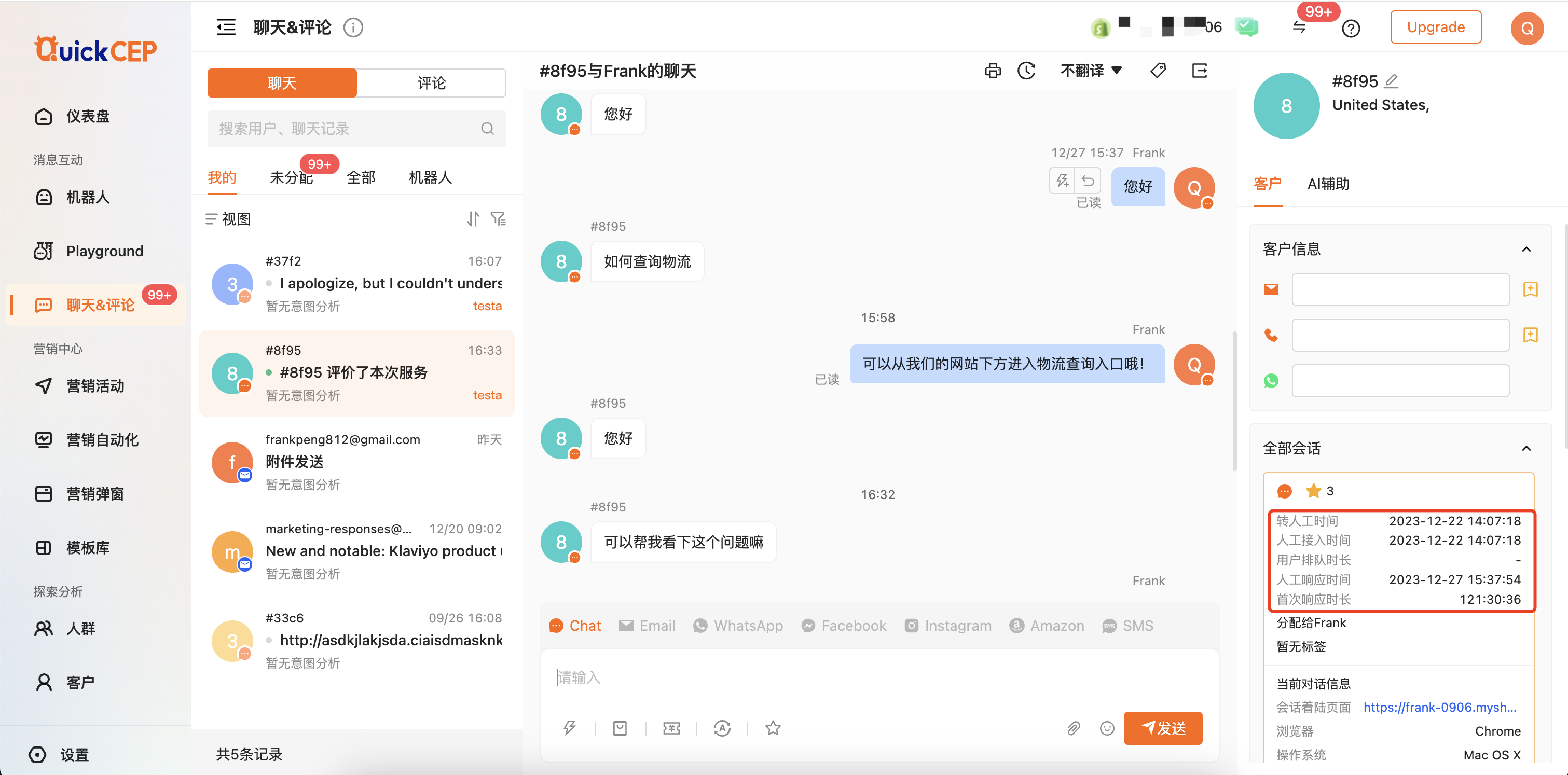(2)聊天侧边栏展示转人工时间、人工接入时间、用户排队时长、人工响应时间、首次响应时长等