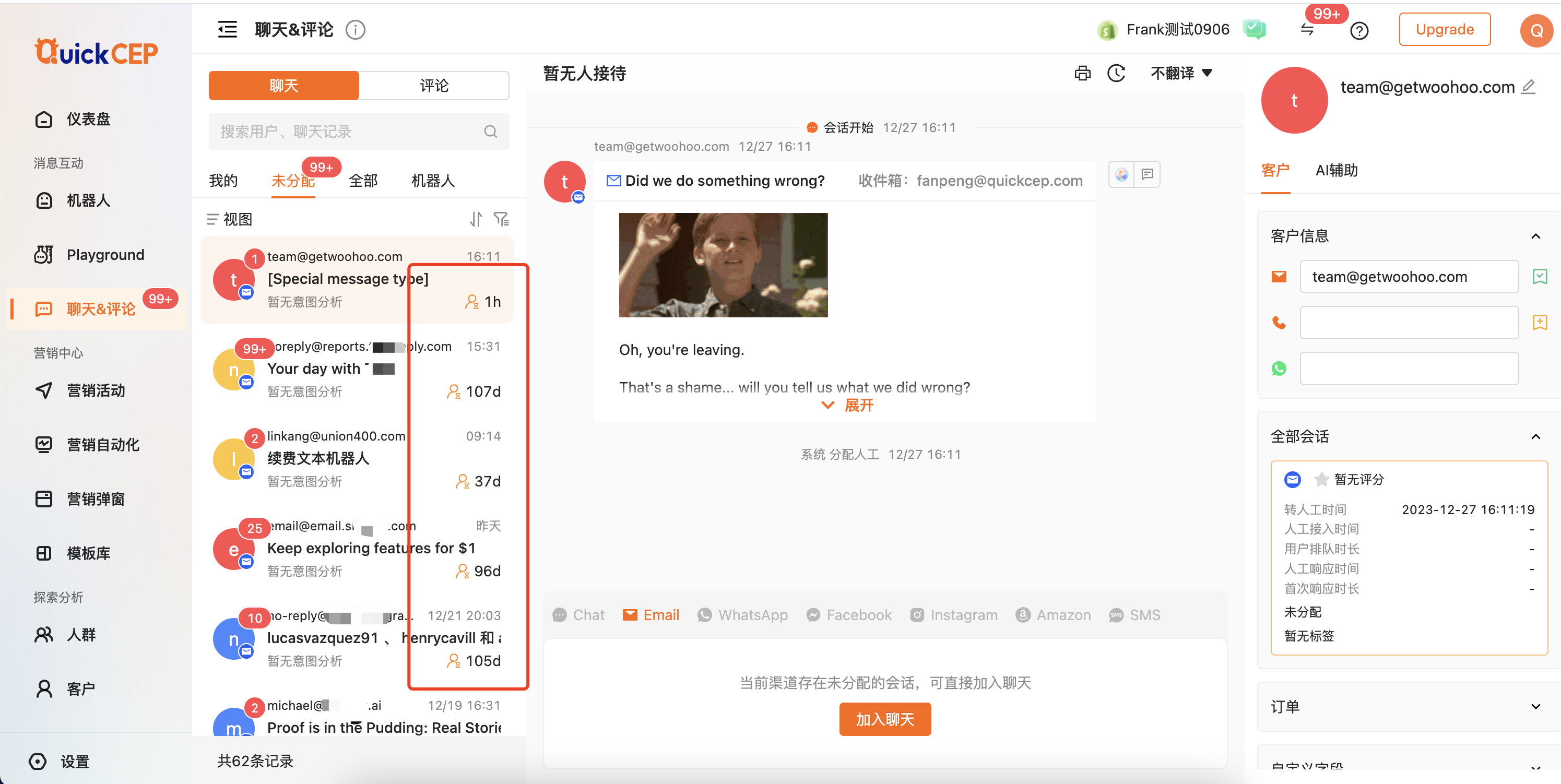 (6)排队时长&排队流失率:聊天统计增加排队时长及排队流失率统计;未分配会话卡片及侧边栏展示排队时长等