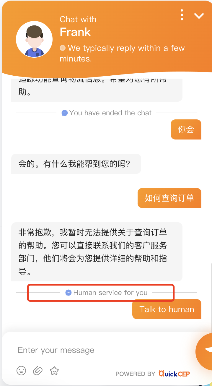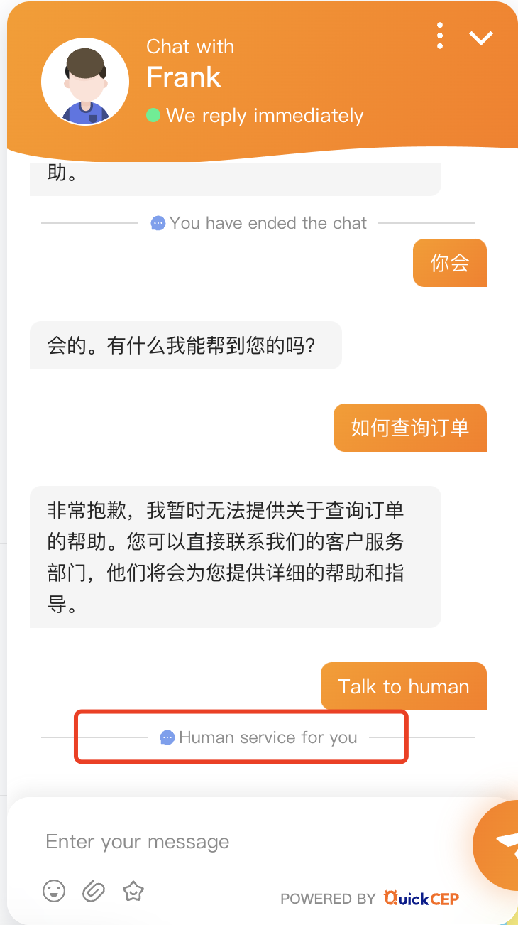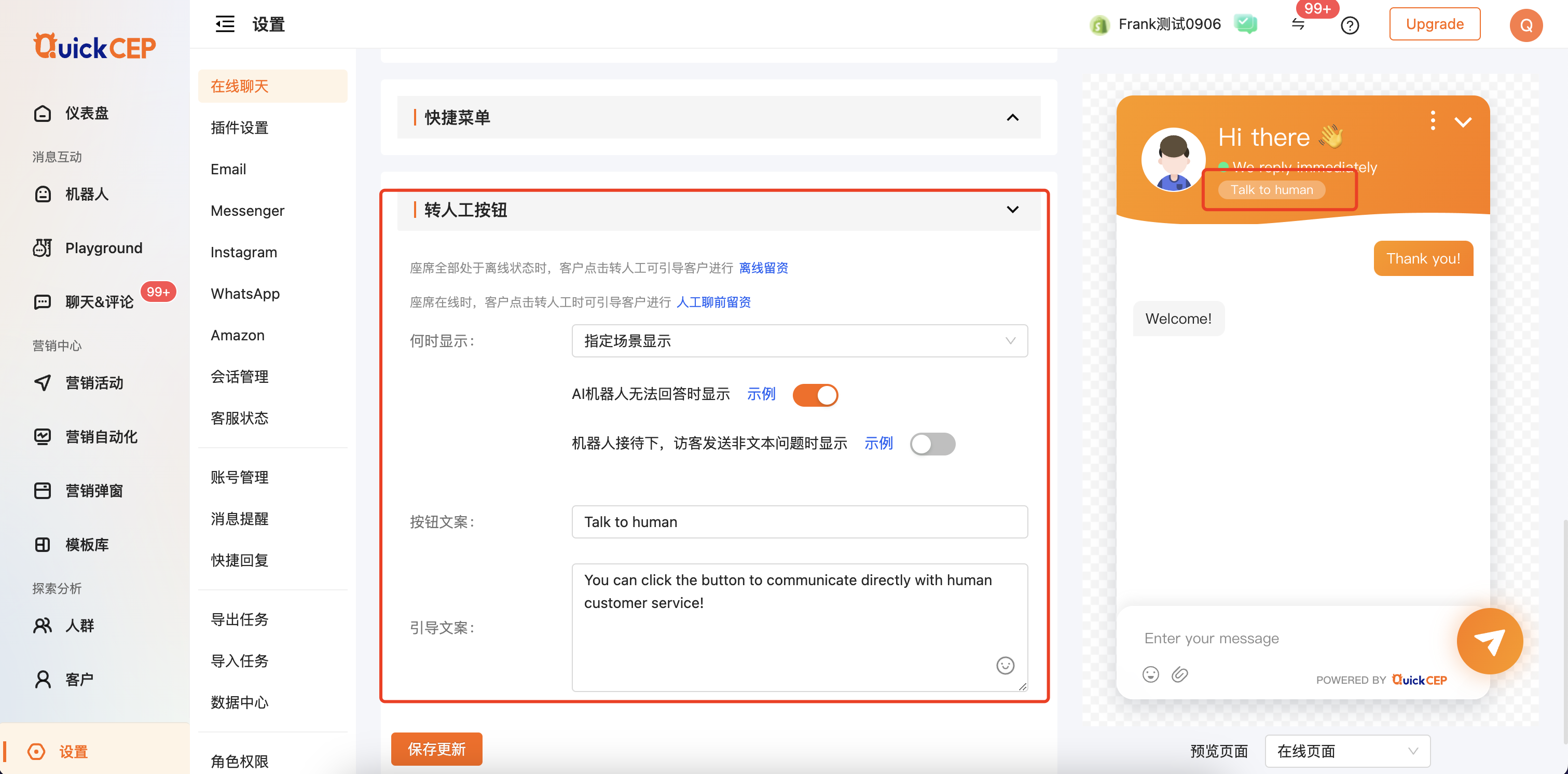 (2)常驻一直显示:会话转人工前访客端会一直展示转人工按钮,转人工后将不再展示;
