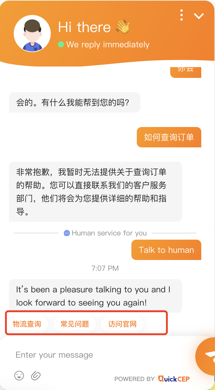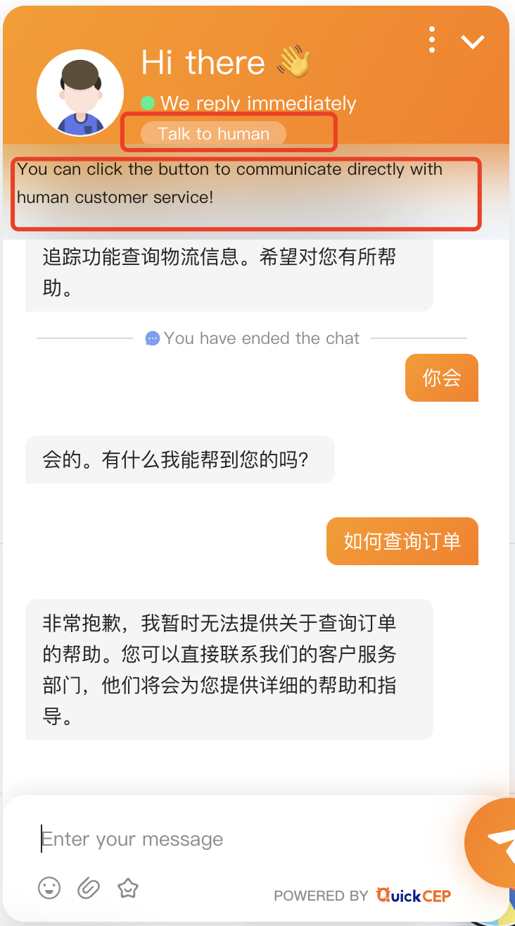 (1)指定场景显示:在AI大模型机器人回复无答案兜底时可展示转人工按钮;在访客发送图片等非文本问题,机器人无法接待时可展示转人工按钮;