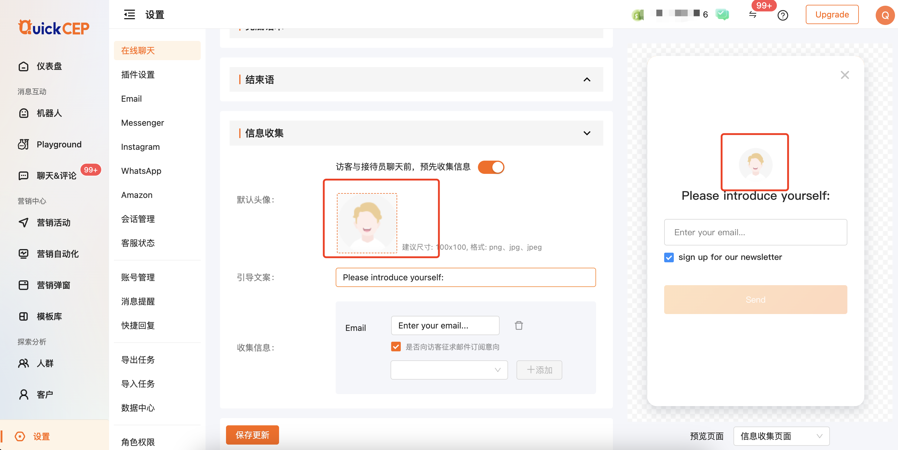 (8)留资头像自定义:信息收集模块支持用户自定义上传留资页面头像,提升品牌体验