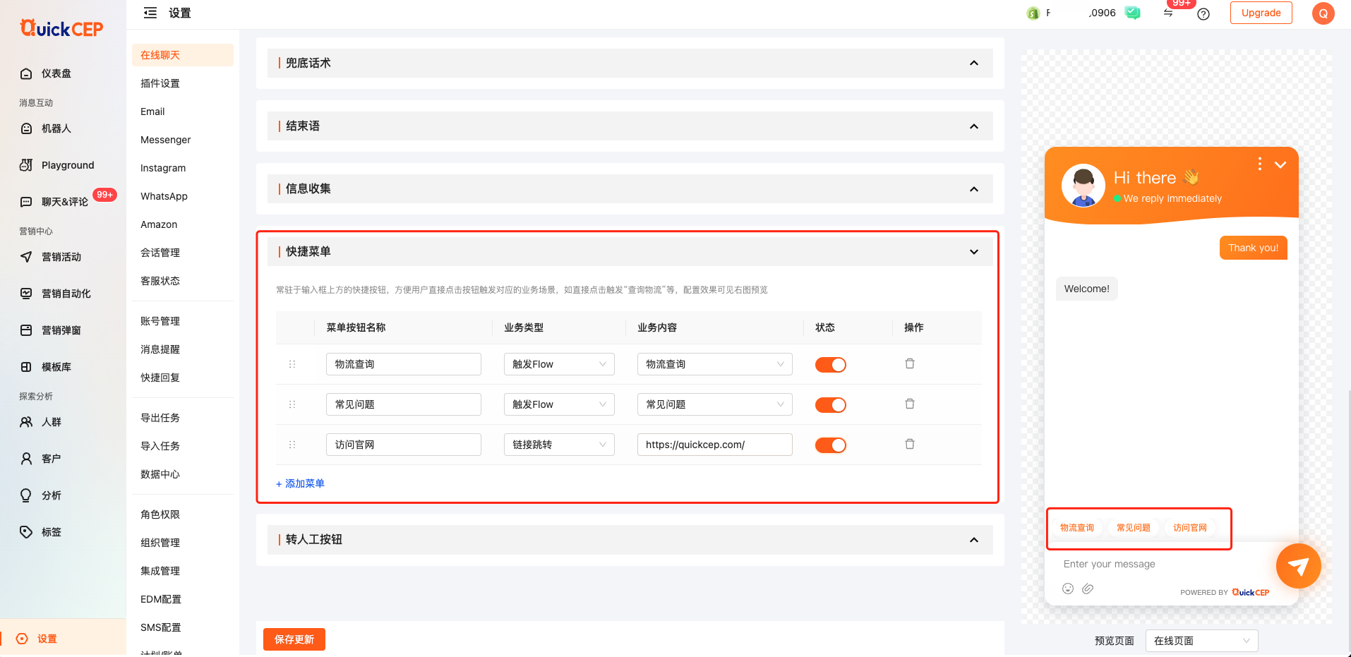 (1)快捷菜单后台配置(支持配置按钮触发Flow Bot或跳转设定的链接)