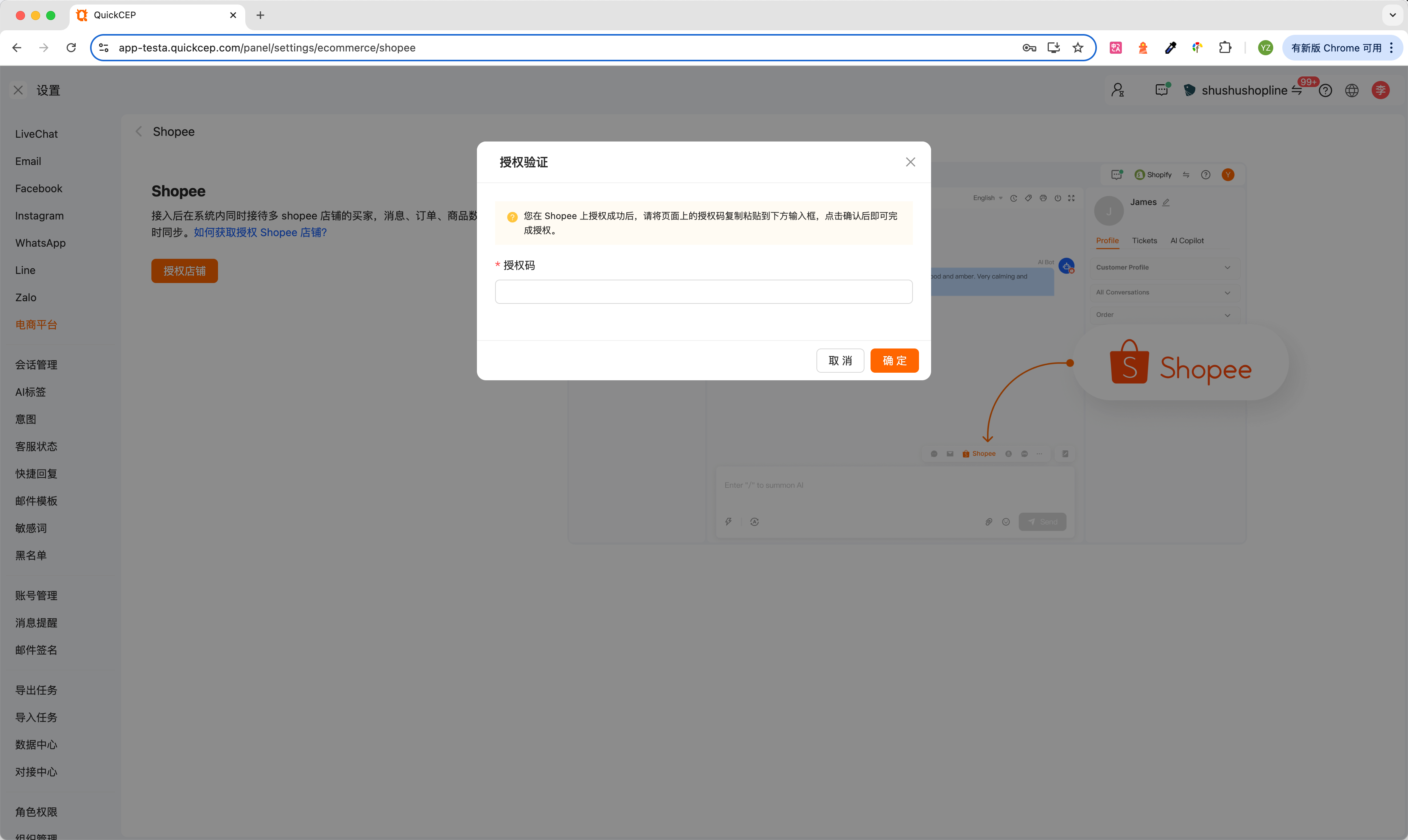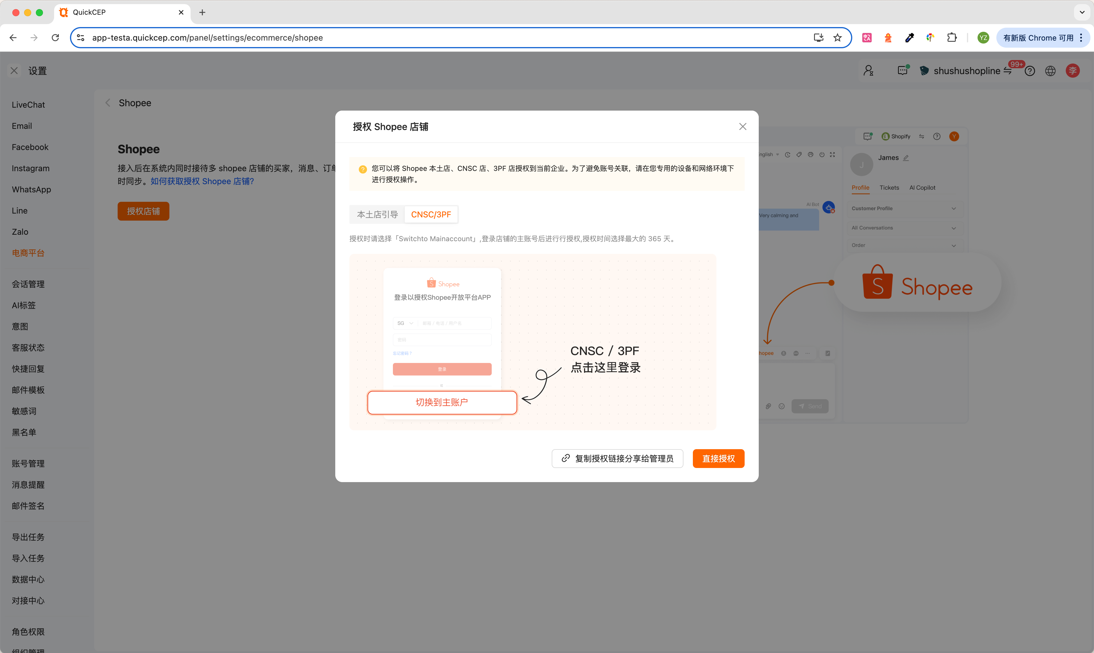 QuickCEP 已支持接入 Shopee 店铺,完成店铺授权后,座席可以在 QuickCEP 统一接待多店铺买家,接待过程中能浏览买家的订单记录,以及店铺的商品。